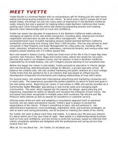 The process is easy. The following RealtyBios “Showrooms” present examples of some of our half-page, one-page (with or without extra features) and larger bios/biographies/profiles. (Also, check out our Realty Team Bios writing & webpage services.)